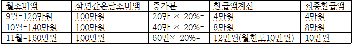 월 소비액 작년 같은 달 소비액 증가분 환급액 계산 최종 환급액