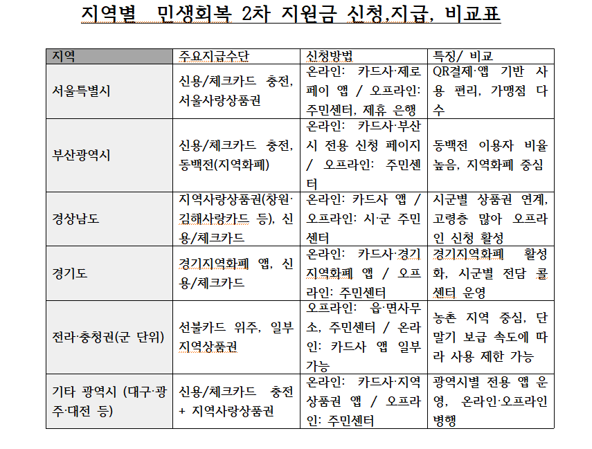서울·부산 같은 광역시는 온라인·앱 중심 신청과 지역화폐 활용도가 높고,
